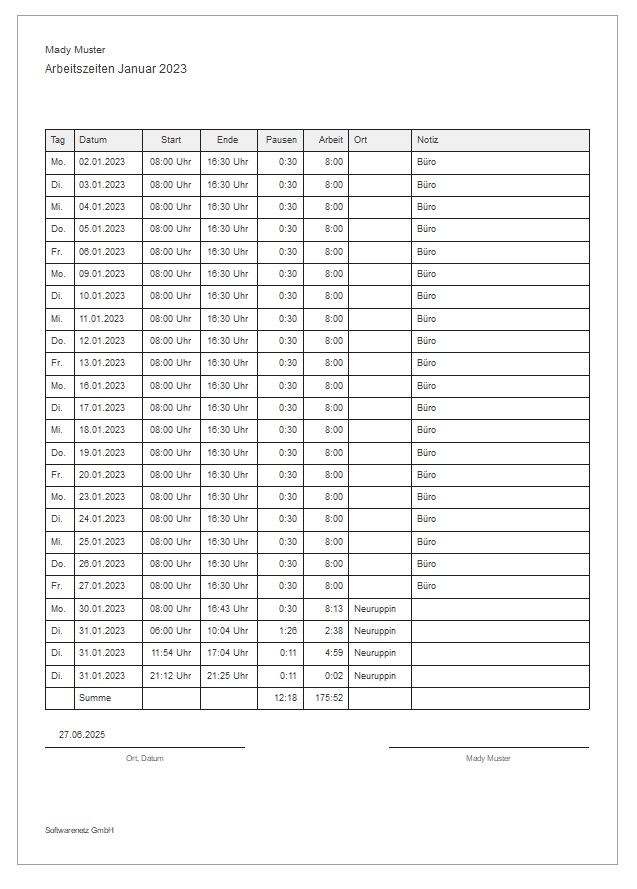Über das Druckersymbol oben rechts, können Sie einmal im Monat den Stundenzettel ausdrucken und vom Mitarbeiter unterschreiben lassen.